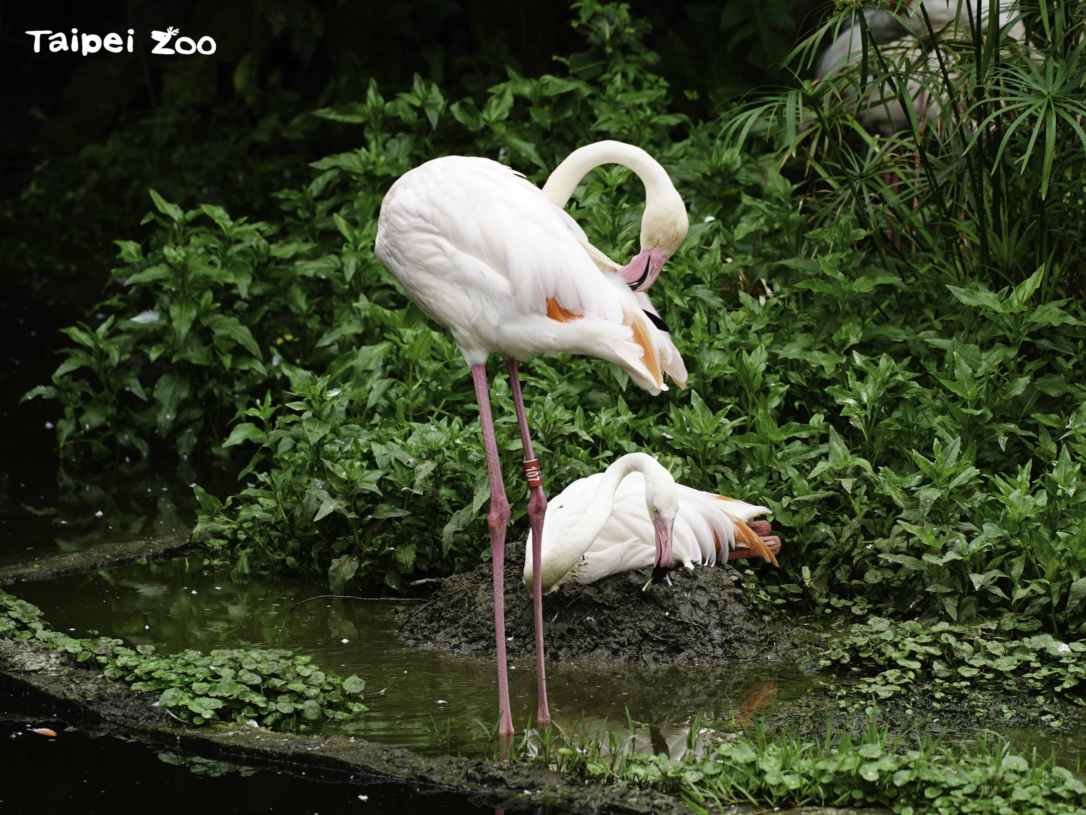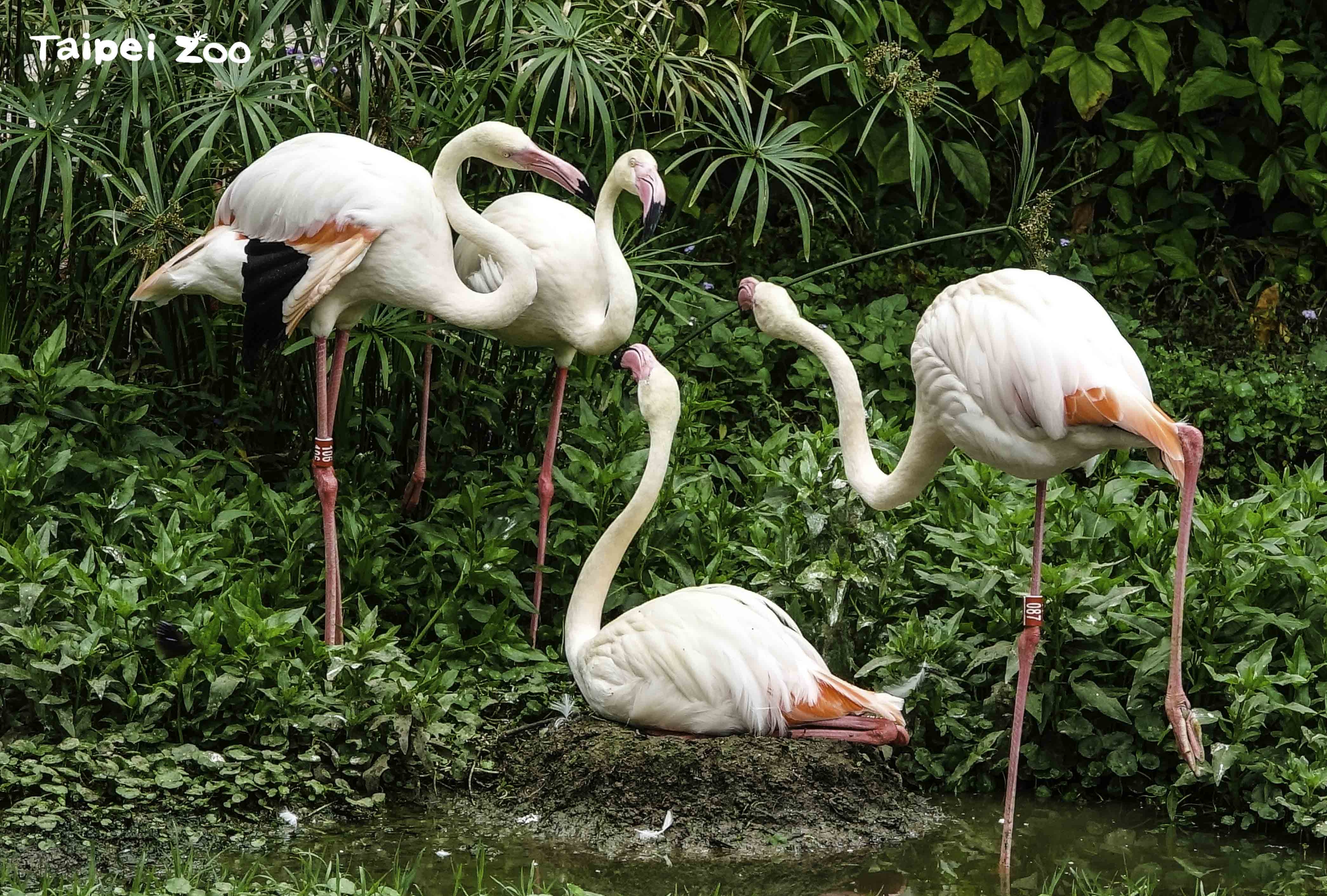不過當美食起不了作用時,保育員就得想想其他的辦法囉!例如民眾進入臺北市立動物園,首先映入眼簾的就是一整群的大紅鶴(Greater Flamingo)。這群大紅鶴的數量總共有29隻,牠們肩負著迎賓大使的重要任務,必須在遊客入園前就先到戶外活動場就定位。每天早上08:55左右,保育員會開啟室內通往戶外活動場的門,沒一會兒功夫就看見大紅鶴們一隻接著一隻,魚貫地從通道走出來。大紅鶴們來到戶外活動場之後似乎不急著去採食,只見有的在水裡走來走去、有的伸展翅膀做運動、有的忙著理羽…幾隻完成配對的大紅鶴,還會為了佔地盤和鄰居吵架呢!